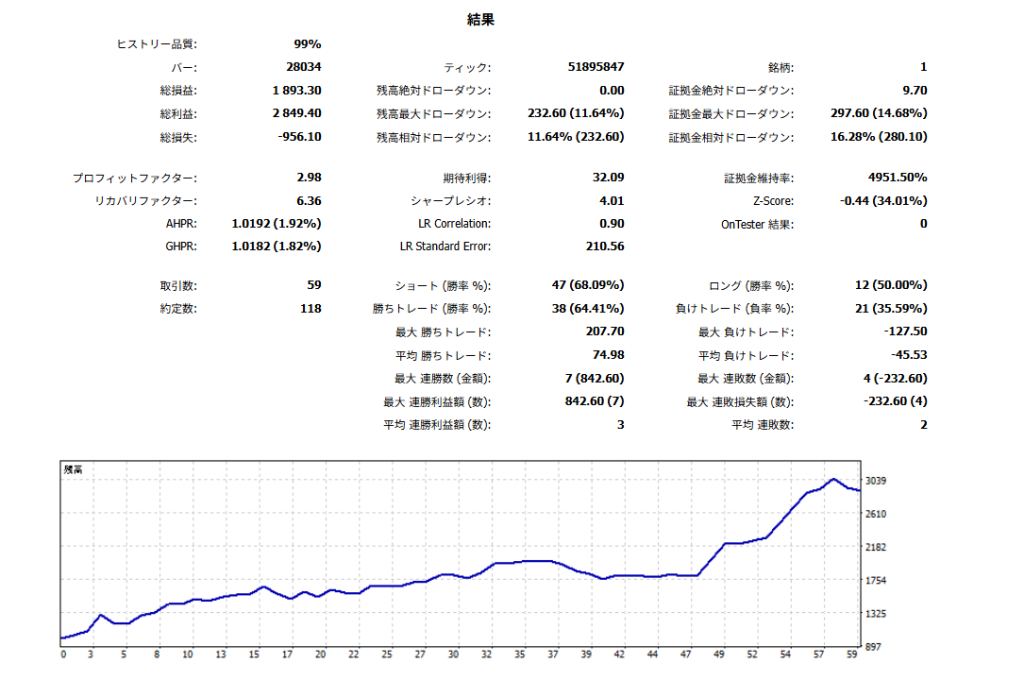 勝率は約64%(59回中38勝)、プロフィットファクター2.98という安定感。