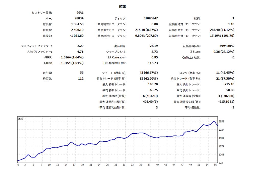 それでも、勝ちトレードの平均利益は68ドル以上あり、ドローダウンも約9.89%に抑えられていることから、資金効率と安全性のバランスが取れた設計です。