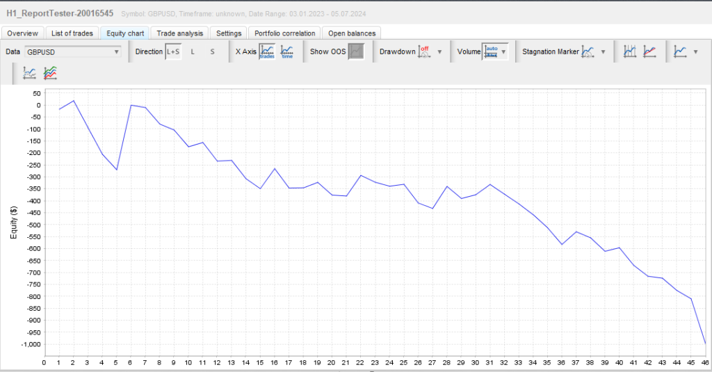 もともとこのEAは1時間足(H1)用として作成しましたが、チューニングをやればやるほど結果が悪くなり、最終的には破綻するまでに(;^_^A