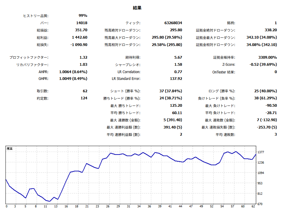 「勝率は38.71%」ながらも、プロフィットファクター1.32最大連勝5回で+391.40ドルと、狙いがハマった時の爆発力が魅力です。