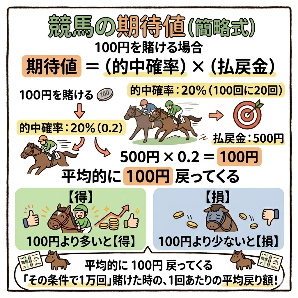 ここで、「期待値」という言葉を紹介します。難しそうに聞こえますが、競馬で考えると一番わかりやすいです。
