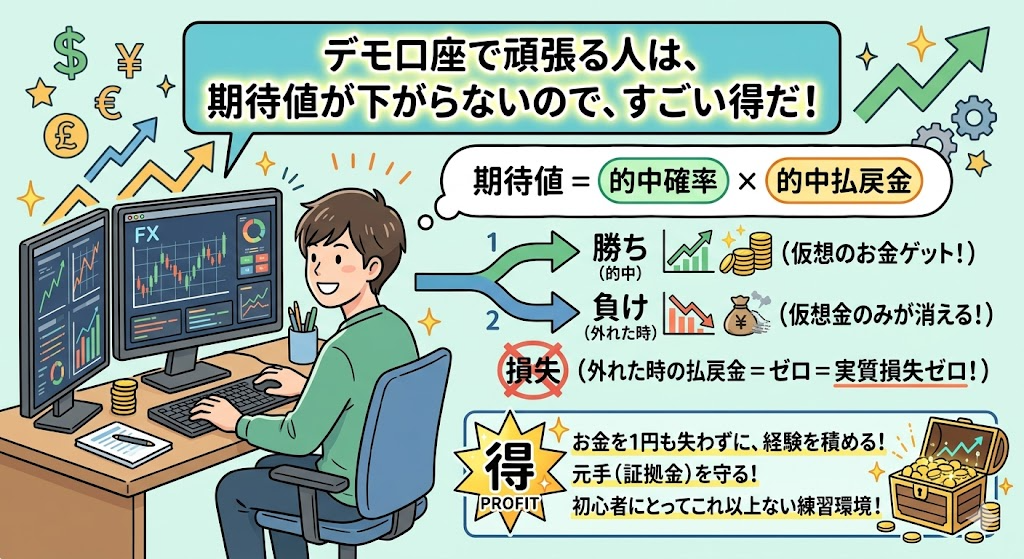 先ほどの期待値の公式に当てはめると、デモ口座での挑戦は期待値が絶対にマイナスにならないということになります。