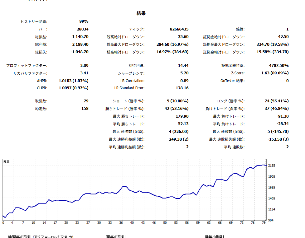 ロジックは慎重で、エントリー数は79回と控えめ。そのぶん“ムダ打ち”が少なく、勝ちトレードでは平均+52pips、負けでも平均-28pipsと、リスクリワードが明確なのが魅力です。