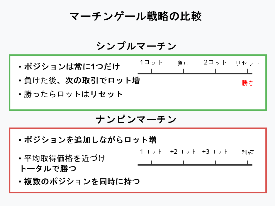 | 比較項目 | シンプルマーチン | ナンピンマーチン |